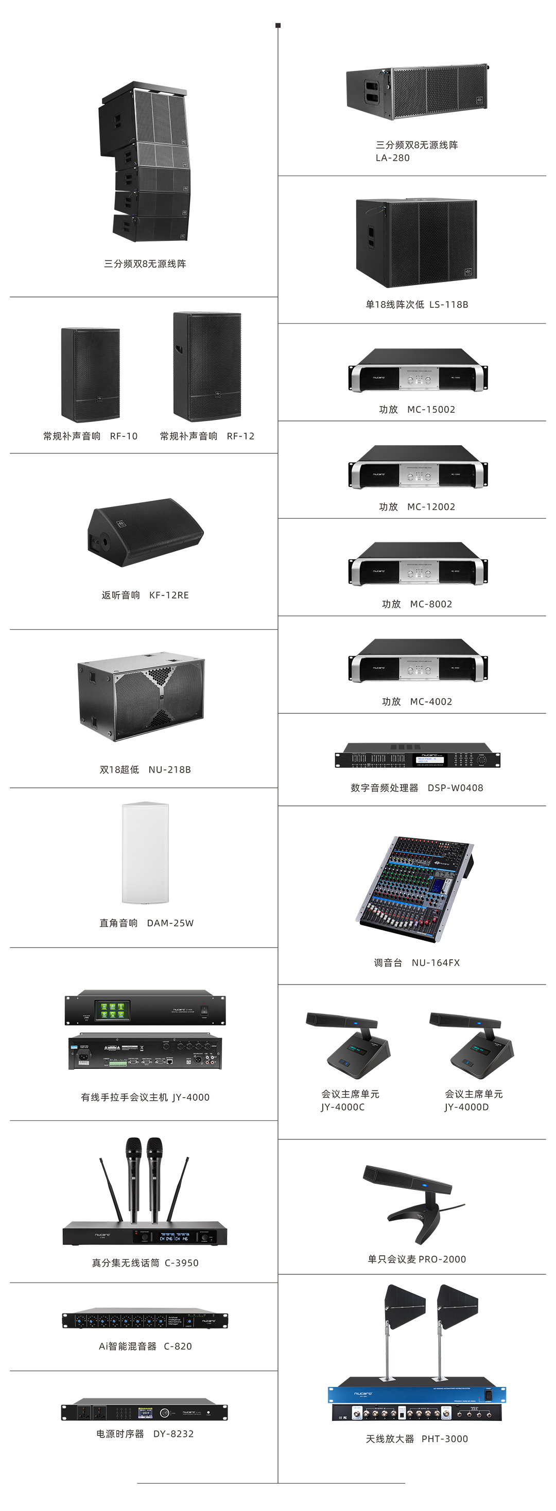 3、大会议报告厅的初期扩声系统设计推荐:为达到高保真重放的扩声要求(国家一级标准),工程师在对现场建声环境进行测量后,进行了多次声学模拟,推荐扩声部分设计为:NIUCARD(纽卡)线性阵列音箱LA-280作为主扩声。将扩声及拾音均匀真实的覆盖至报告厅全场, RF-12全频音箱作为辅助补声音箱,覆盖会场后区, KF-12RE作为舞台返送音箱,负责舞台扩声返送监听,RF-08作为台唇补声, NU-218B落地双18寸超重低频音箱,负责对超低音的补偿,再配搭MC系列功放,周边设备,数字音频处理器,内置32种最新效果器的调音台形成了完美的搭配。拾音部分方案设计为:HIFI级别高保真有线会议手拉手主机JY-4000作为会议主机,配套主席单元JY-4000C和代表单元JY-4000D以及真分集无线话筒C-3950,天线放大器、电源时序器等设备,从而保证了声音的真实还原,构成一套完整的扩声系统;