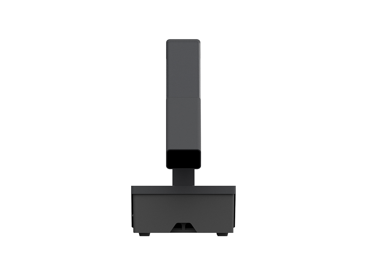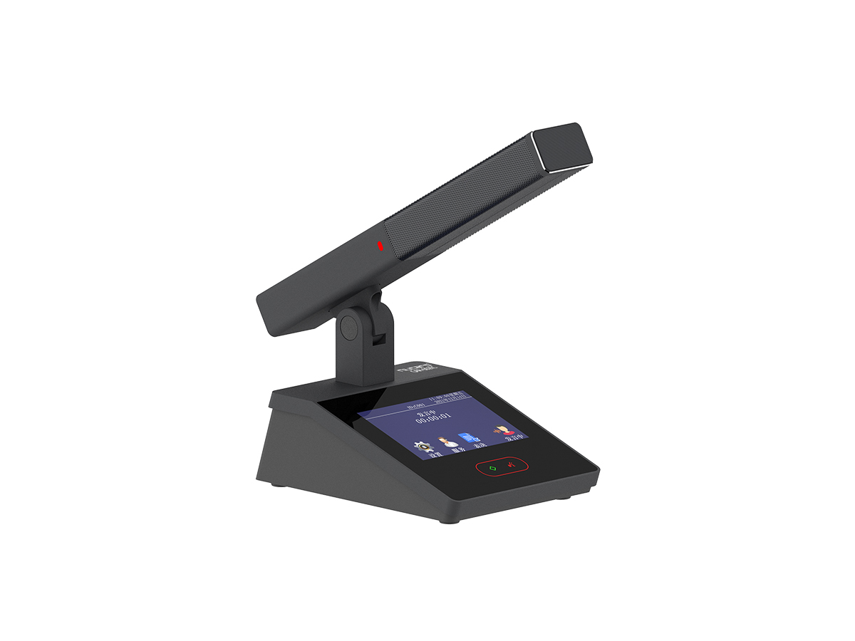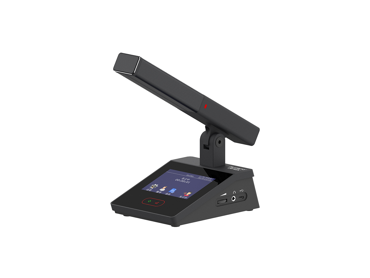 本系统设计为柱形咪杆结够,提高拾音灵敏度和拾音范围。表面采用防掉色的氧化处理技术,话筒咪芯采用软橡胶避震,过滤由桌面震动带来的杂音。咪杆采用磁吸方式与底座连接,及稳定又方便拆卸。显示屏上可以进行会务操作,图片定制显示等功能。