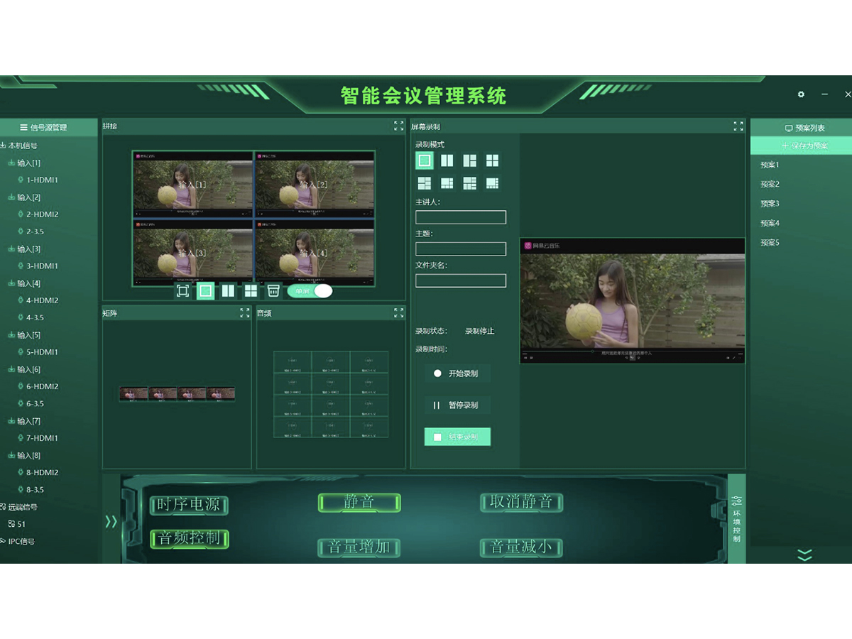 会议多功能管理主机集成信号可视化切换、IPC接入、中控控制、录播、物联网等多个系统,实现对会议进行多功能集中管理;